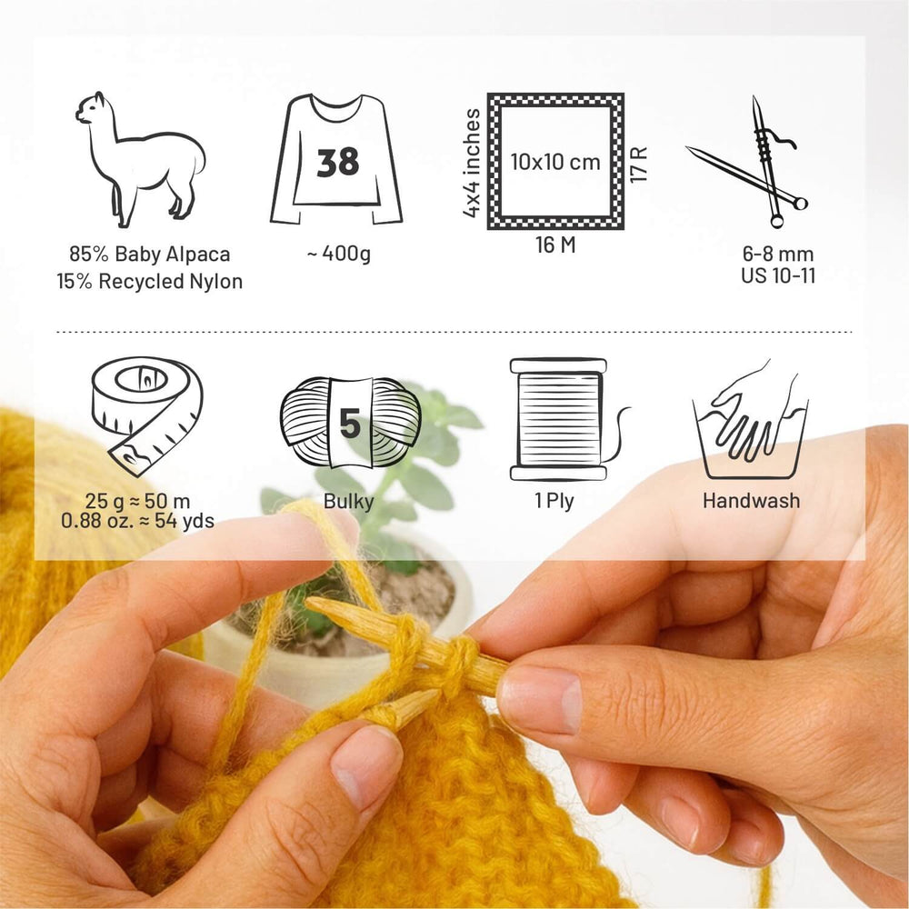 85% Babyalpaka & 15% Recycled Nylon – 25g/50m pro Knäuel. Du erhältst ein Vorteilspack mit 6 x 25g Knäueln.