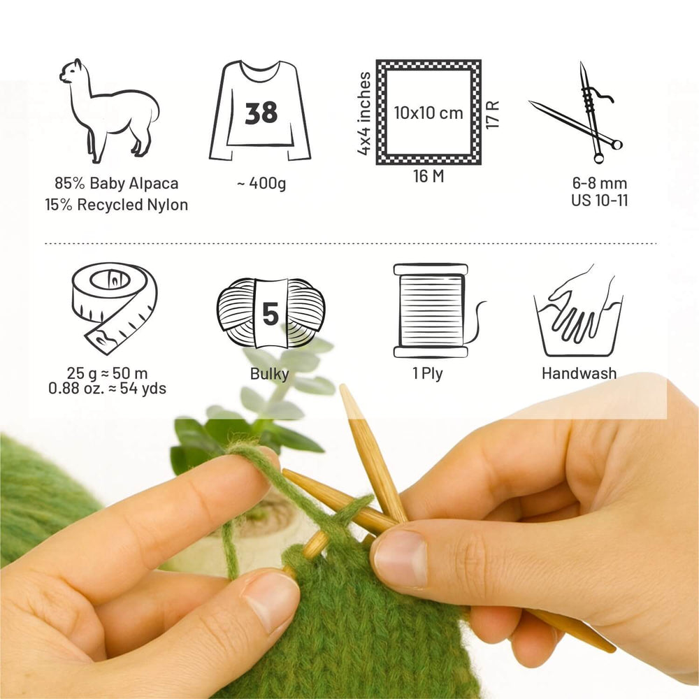 85% Babyalpaka & 15% Recycled Nylon – 25g/50m pro Knäuel. Du erhältst ein Vorteilspack mit 6 x 25g Knäueln.