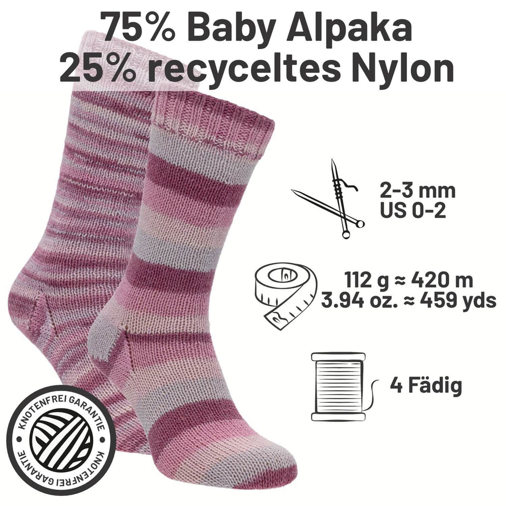 Strapazierfähig, weich und maschinenwaschbar – dank alpacare® Veredelung und recyceltem Nylon ist dieses Garn besonders umweltfreundlich. Ideal nicht nur für Socken, sondern auch für Baby- und Kinderkleidung sowie vielseitige Alltagsprojekte. Erhältlich in Uni-Farben und als lebendige Printed-Variante.