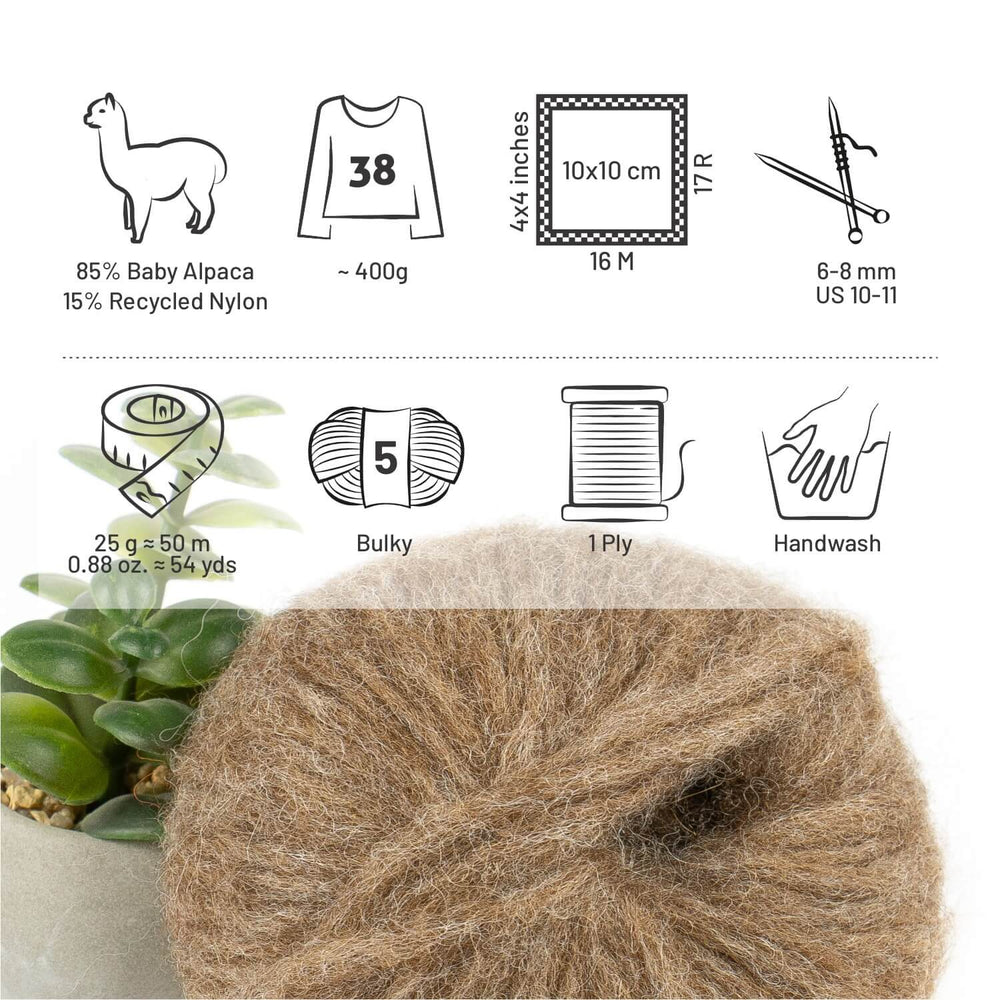 85% Babyalpaka & 15% Recycled Nylon – 25g/50m pro Knäuel. Du erhältst ein Vorteilspack mit 6 x 25g Knäueln.