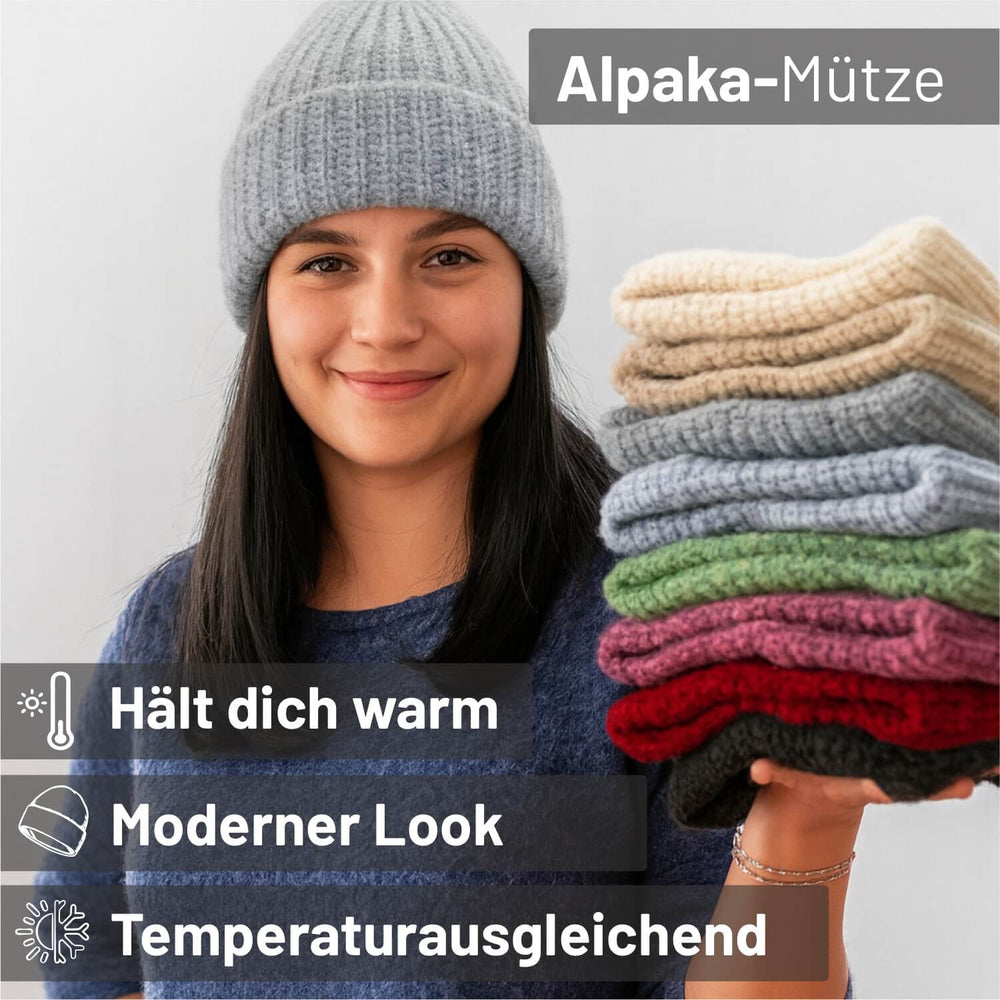 Pflege deine Alpakamütze liebevoll: Handwäsche, vorsichtig ausdrücken und liegend trocknen – fern von direkter Hitze.